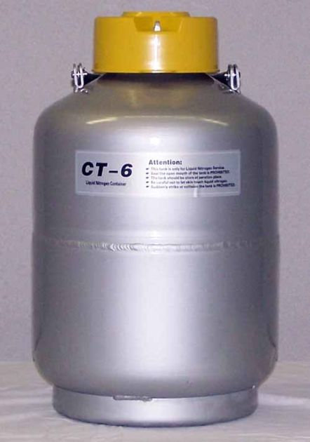 The CT-6 tank is small and light in weight. It's great for short term storage of small amounts of semen. Because of it's small size, the canisters are shorter than in our other tanks. If you use canes they have to be bundled together to keep them from spreading out and becoming very difficult to get though the mouth of the tank. It's padded insulated cover protects tank and reduces liquid nitrogen loss. Also included are 6 canisters.