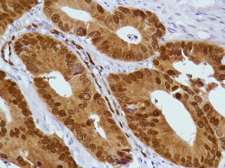 CDX2 is a caudal type homeobox gene that encodes an intenstine-specific transcription factor that is expressed early in intestinal development and may be involved in the regulation of proliferation and differentiation of intestinal epithelial cells. It is expressed in the nuclei of epithelial cells throughout the intestine, from duodenum to rectum. The CDX2 protein is expressed in primary and metastatic colorectal carcinomas and has also been demonstrated in the intestinal metaplasia of the stomach and intestinal-type gastric cancer, while it is not expressed in the normal gastric mucosa. Studies have shown that CDX2 is superior marker compared in CK20.