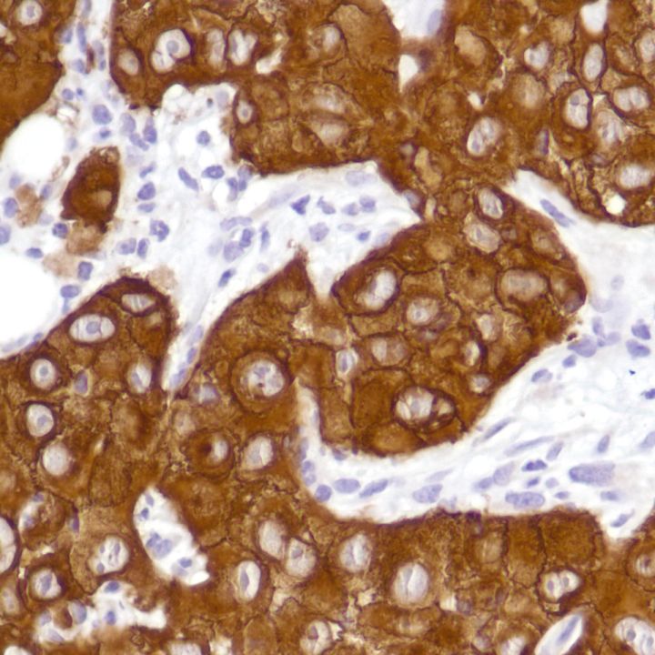 EGFR is a transmembrane tyrosine kinase that belongs to the HER/erbB protein family. Somatic mutations in the tyrosine kinase domain of EGFR are present in a subset of lung adenocarcinoma. Two types of mutations account for approximately 90% of mutant cases: a specific point mutation L858R which occurs in exon 21 and short in-frame deletions in exon 19. A common lesion in exon 19 is the deletion of E746-A750, although other variants can also occur.