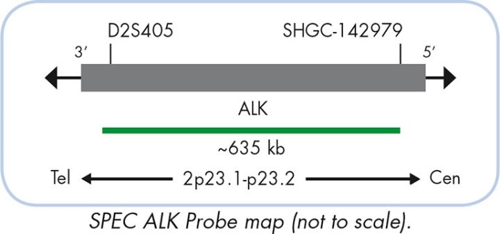 Probe Description: The SPEC ALK/2q11 Dual Color Probe is a mixture of a green fluorochrome direct labeled SPEC ALK probe hybridizing to the human ALK gene in the chromosomal region 2p23.1-p23.2 and an orange fluorochrome direct labeled SPEC 2q11 probe. The SPEC 2q11 probe is specific for the AFF3 (AF4/FMR2 family, member 3) gene region in 2q11.2. Due to crosshybridizations of chromosome 2 alpha satellites to other centromeric regions, probes specific for 2q11 are frequently used for chromosome 2 copy number detection.