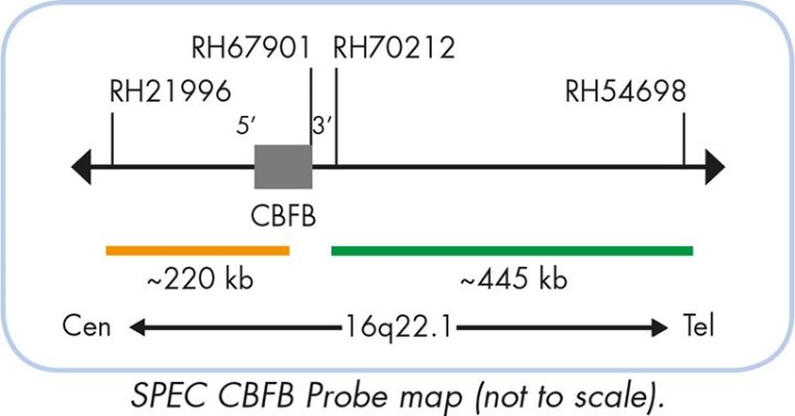 The ZytoLight SPEC CBFB Dual Color Break Apart Probe is designed to detect rearrangements involving the CBFB (core-binding factor beta, a.k.a. PEBP2B) gene. The chromosomal aberrations inv(16)(p13.1q22.1) and the related translocation t(16;16)(p13.1;q22.1), which have been detected in about 10% of patients with AML, lead to the fusion of the CBFB gene with the MYH11 gene. AML patients with these genetic rearrangements have a favorable prognosis. Inv(16) may sometimes be difficult to identify using conventional cytogenetic analysis. Accordingly, FISH proved to be a reliable method overcoming this problem and might consequently be a helpful tool to predict the prognosis of AML patients.