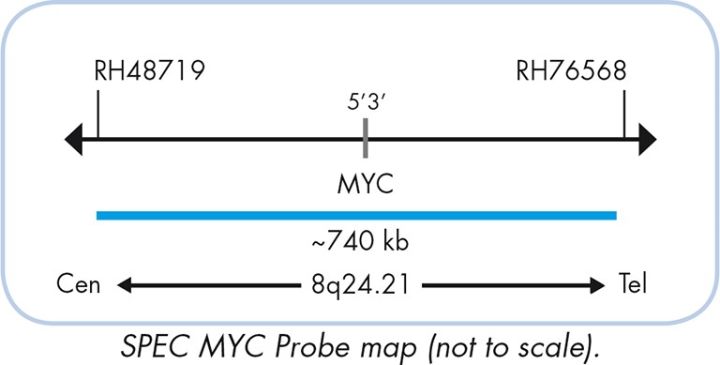 The ZytoLight ® SPEC MYC/CDKN2A/ ERBB2/ZNF217 Quadruple Color Probe is designed for the simultaneous detection of the MYC (a.k.a. CMYC), CDKN2A (a.k.a. p16), ERBB2 (a.k.a. HER2), and ZNF217 gene copy number status. Barrett‘s esophagus (BE), a preneoplastic condition in which the squamous epithelium of the distal esophagus undergoes transformation to intestinal metaplasia, is considered a precursor for the development of adenocarcinoma. The evolution of cancer from BE includes the following stages: metaplasia, low-grade dysplasia, high-grade dysplasia (HGD), and esophageal adenocarcinoma (EA). EA has a poor prognosis unless detected and treated at its earliest stages. It is believed that the progression of normal squamous epithelium to EA in patients with BE results from the accumulation of genetic alterations including, e.g., CDKN2A loss or gain of the MYC, ERBB2, or ZNF217 gene locus. Hence, detection of these aberrations may provide useful information on disease progression. Moreover, allelic loss of CDKN2A was shown to result in decreased response to photodynamic therapy in patients with HGD and EA. In addition, detection of ERBB2 amplifications may help in selecting patients eligible for an ERBB2 targeted therapy such as trastuzumab.