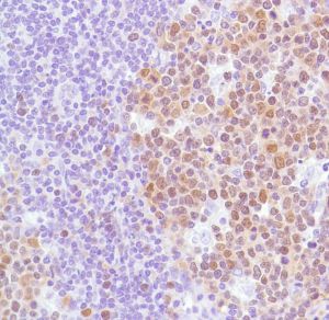 B cell lymphoma 6 protein (Bcl-6) proto-oncogene product (a Kruppel-type zinc-finger protein) is mainly expressed in normal germinal center B cells and related lymphomas. Bcl-6 is involved in chromosome rearrangements at 3q27 in non-Hodgkin’s lymphomas and Bcl-6 rearrangements have been detected in 33%-45% of diffuse large B cell lymphomas. Bcl-6 has been detected immunohistochemically in follicular lymphomas, diffuse large B cell lymphomas, Burkitt lymphomas and in nodular, lymphocyte predominant Hodgkin’s disease.
