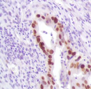 p53 is a tumor suppressor gene expressed in a wide variety of tissue types and is involved in regulating cell growth, replication, and apoptosis. It binds to mdm2, SV40 T antigen and human papilloma virus E6 protein. p53 senses DNA damage and possibly facilitates repair. Mutation involving p53 is found in a wide variety of malignant tumors, including breast, ovarian, bladder, colon, lung, and melanoma.