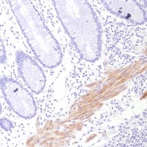 Calponin-1 is a smooth muscle-specific protein and interacts with actin, calmodulin, troponin C and tropomyosin to regulate smooth muscle contract. It is also expressed by myoepithelial cells, myofibroblasts, keratinocytes, nerve fibers, smooth muscle cell tumors such as glomus tumors and myofibrosarcoma, and tissues containing significant amounts of smooth muscle.
