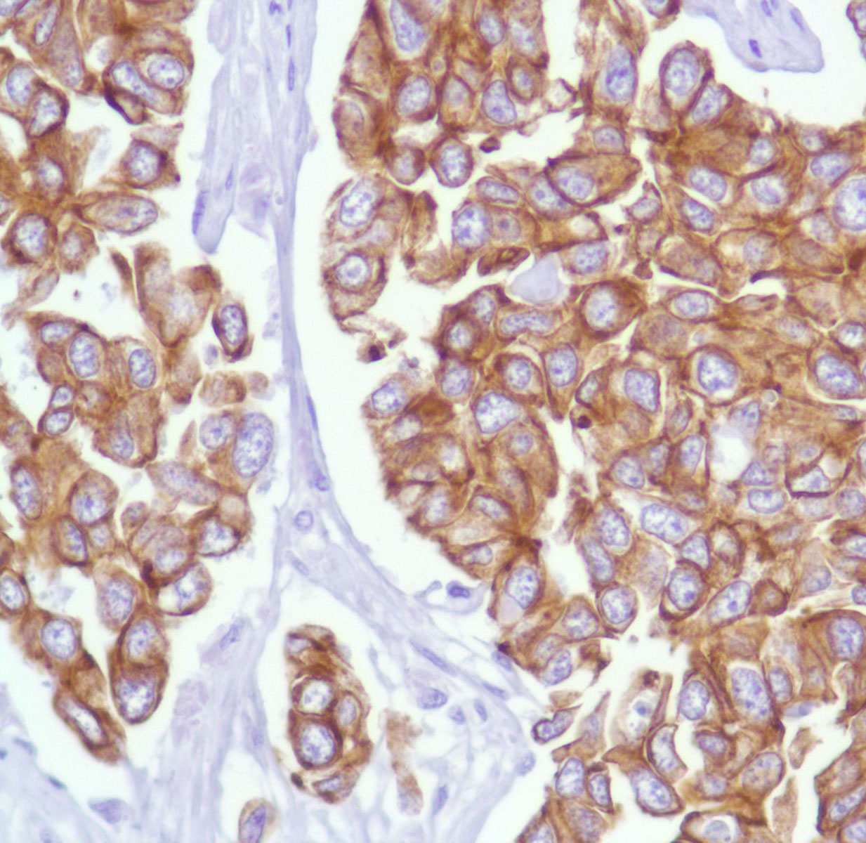 Cytokeratin 18 is an acidic keratin which is found primarily in non-squamous epithelia and is present in a majority of adenocarcinomas and ductal carcinomas but not in squamous cell carcinomas. Cytokeratin 18 exists in combination with Cytokeratin 8, a basic keratin. Hepatocellular carcinomas express only Cytokeratins 8 and 18.