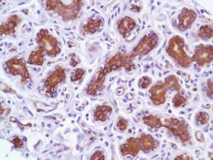 Tau is a neuronal microtubule associated protein found predominantly on axons. The function of rau is to promote tubulin polymerization and stabilize microtubules, but it also serves to link certain signaling pathways to the cytoskeleton. Tau, in its hyperphosphorylated form, is the major component of paired helical filaments (PHF) and neurofibrillary lesions in Alzheimer's disease (AD) brain. Hyperphosphorylation impairs the microtubule binding function of tau, resulting in the destabilization of microtubules in AD brains, ultimately leading to the degeneration of the affected neurons. Hyperphosphorylated tau is also found in a range of other central nervous system disorders. Numerous serine/threonine kinases, including GSK3 beta, PKA, Cdk5, and casein kinase II can phosphorylate tau. Alternate splicing of tau mRNA and differential phosphorylation contributes to the heterogeneity of Tau.