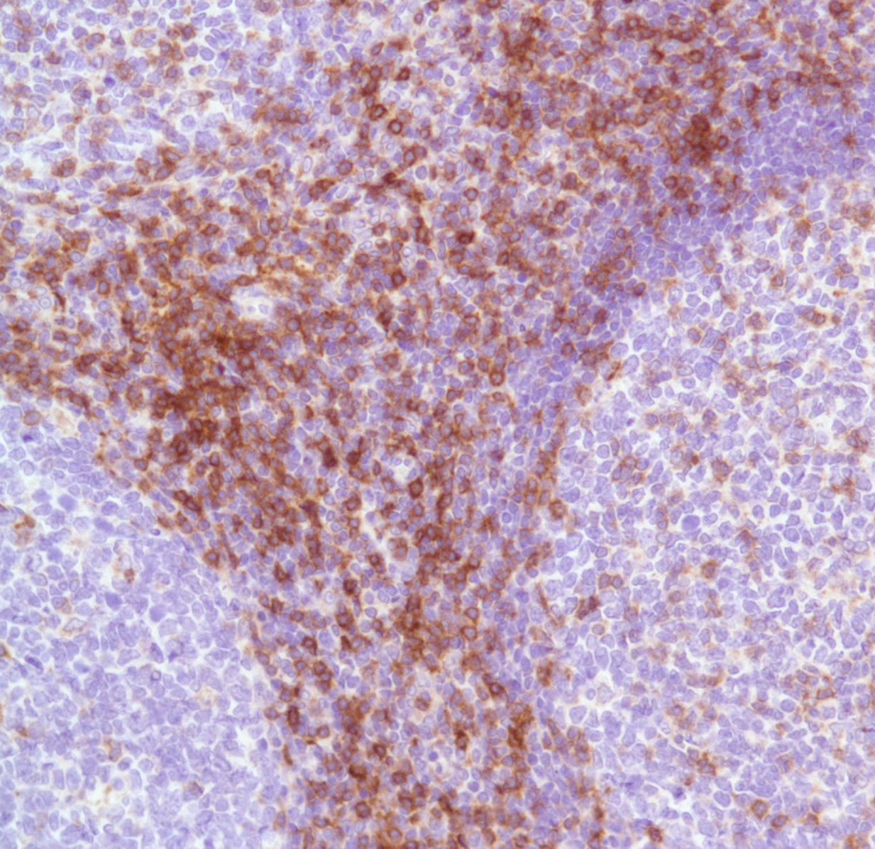 CD7 (gp40, Leu9) is a member of the immunoglobulin gene superfamily. Its N-terminal amino acids 1-107 are highly homologous to Ig kappa-L chains whereas the carboxy-terminal region of the extracellular domain is proline-rich and has been postulated to form a stalk from which the Ig domain projects. CD7 is expressed on the majority of immature and mature T-lymphocytes, and T cell leukemia. It is also found on natural killer cells, a small subpopulation of normal B cells and on malignant B cells. Cross-linking surface CD7 positively modulates T cell and NK cell activity as measured by calcium fluxes, expression of adhesion molecules, cytokine secretion and proliferation. CD7 associates directly with phosphoinositol 3'-kinase. CD7 ligation induces production of D-3 phosphoinositides and tyrosine phosphorylation.
