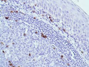 J chain is a small glycopeptide and is structurally unrelated to heavy or light chains, but is synthesized by all plasma cells that secrete polymeric immunoglobulins. J chain is linked to IgA and IgM by disulfide bonds, however, it has been detected in IgG- and IgD-containing cells. J chains are present in a large proportion of the immunoglobulin-positive cells in the germinal centers of the tonsil and lymph node. B cells secrete J chain at an early stage of differentiation with the expression persisting in those cells destined to produce IgA or IgM.