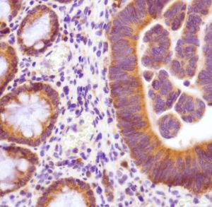 Thymidylate Synthase (TS) (EC 2.1.1.45) converts deoxyuridine monophosphate (dUMP) to deoxythymidine monophosphate (dTMP), which is essential for DNA biosynthesis. TS is a critical target for the fluoropyrimidines, an important group of anti-neoplastic drugs that are widely used in the treatment of solid tumors. Both 5-FU and fluorodeoxyuridine are converted in tumor cells to FdUMP which inactivates TS by formation of a ternary covalent complex in the presence of the folate cofactor 5,10-methylenetetrahydrofolate. Overexpression of TS has been demonstrated in many types of tumors including breast, colon, gastric and melanoma.