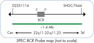 The ZytoLight SPEC BCR/ABL1 Dual Color Dual Fusion Probe is designed for the detection of the specific translocations involving the chromosomal region 9q34.12 harboring the ABL1 gene, and the chromosomal region 22q11.23, harboring the BCR gene. Rearrangements involving t(9;22)(q34.1;q11.2) are observed in approx. 90% of patients with chronic myeloid leukemia (CML) and in approx. 25% of adults with acute lymphoblastic leukemia (ALL).
