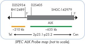 The ZytoLight SPEC ALK/EML4 TriCheckTM Probe is designed to detect inversions involving the chromosomal region 2p23.1-p23.2 harboring the ALK gene and the chromosomal region 2p21 harboring the EML4 gene. Moreover, using this probe it is possible to discriminate between EML4-ALK inversions and translocations affecting ALK, but not EML4.