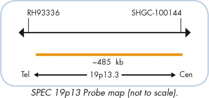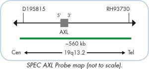 ZytoLight SPEC AXL/19p13 Dual Color Probe in hybridization buffer. The probe contains green-labeled polynucleotides (ZyGreen: excitation at 503 nm and emission at 528 nm, similar to FITC), which target the AXL gene in 19q13.2, and orange-labeled polynucleotides (ZyOrange: excitation at 547 nm and emission at 572 nm, similar to rhodamine), which target sequences of chromosome 19 in the chromosomal region 19p13.3.