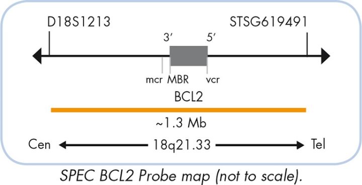 Translocations involving the BCL2 (B-cell lymphoma 2) gene and the IGH (immunoglobulin heavy locus, a.k.a. IGH@) gene are considered to be cytogenetic hallmarks for follicular lymphoma (FL). FL represents one of the most common nonHodgkin lymphoma (NHL). About 75% of breakpoints on chromosome 18 are clustered in the major breakpoint region (MBR) and the minor cluster region (mcr), whereas the remaining breakpoints are scattered between these clusters, or at the 5’ side (variant cluster region or vcr) of the BCL2 gene