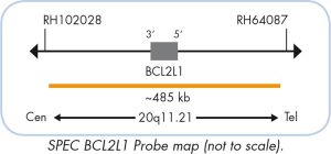 The ZytoLight ® SPEC BCL2L1/CEN 20 Dual Color Probe is designed for the detection of BCL2L1 gene amplifications. The BCL2L1 (BCL2-like 1, a.k.a. BCLX) gene is located in the chromosomal region 20q11.21 and encodes for an antiapoptotic protein that belongs to the BCL2 family. These genes are involved in a wide variety of cellular activities including lymphocyte development and hematopoiesis. BCL2L1 amplifications have been reported in several human cancers including lung, ovarian breast, melanoma, and hematologic malignancies.