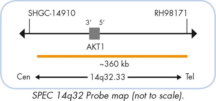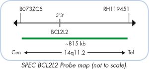 The ZytoLight ® SPEC BCL2L2/14q32 Dual Color Probe is designed for the detection of BCL2L2 gene amplifications. The BCL2L2 (BCL2-like 2, a.k.a. BCL-W) gene is located in the chromosomal region 14q11.2 and encodes for an anti-apoptotic protein that belongs to the BCL2 family. These genes are involved in a wide variety of cellular activities including lymphocyte development and hematopoiesis. BCL2L2 amplifications have been reported in several human cancers including lung, ovarian, breast, and hematologic malignancies. BCL2L2 amplifications are found in many tumor cell lines with resistance to chemotherapeutic agents. Targeting the BCL2 family proteins with small non-peptidic compounds, so called BH3-mimetics, is currently investigated in clinical trials. Hence, the identification of BCL2L2 amplifications by Fluorescence in situ Hybridization and the inhibition of BCL2L2 signaling may be of therapeutic significance in various types of tumors.