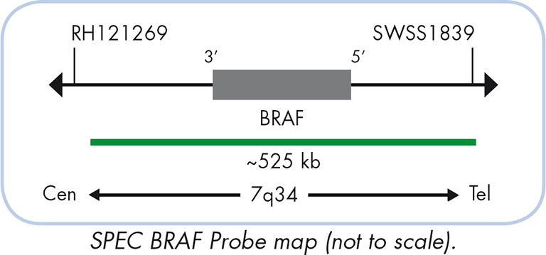 The ZytoLight ® SPEC BRAF/CEN 7 Dual Color Probe is designed for the detection of amplifications involving the chromosomal region 7q34 harboring the BRAF gene (B-Raf proto-oncogene, serine/ threonine kinase). The BRAF gene encodes a protein-serine/threonine kinase that participates in the MAPK cascade, which regulates a large variety of cell processes. Activating mutations in BRAF are found in many tumor types, including malignant melanoma, thyroid, colorectal, and ovarian carcinomas, lung adenocarcinoma, as well as in some sarcomas and gliomas. These mutations lead to constitutive activation of BRAF thereby promoting tumorigenesis.