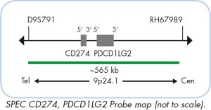 The SPEC CD274, PDCD1LG2/CEN 9 Dual Color Probe is a mixture of a green fluorochrome direct labeled SPEC CD274, PDCD1LG2 probe specific for the CD274 and PDCD1LG2 genes at 9p24.1 and an orange fluorochrome direct labeled CEN 9 probe specific for the classical satellite III region of chromosome 9 (D9Z3) at 9q12.