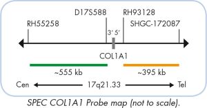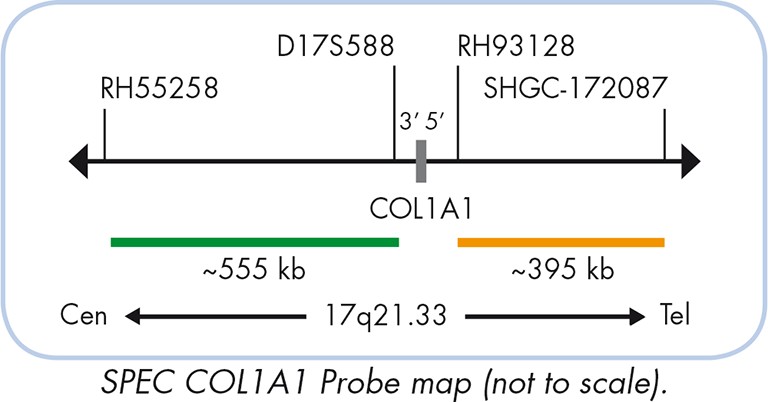 The SPEC COL1A1 Dual Color Break Apart Probe is a mixture of two direct labeled probes hybridizing to the 17q21.33 band. The orange fluorochrome direct labeled probe hybridizes distal, and the green fluorochrome direct labeled probe hybridizes proximal to the COL1A1 gene.