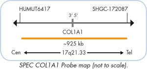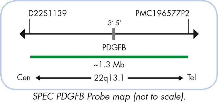 The ZytoLight ® SPEC COL1A1/PDGFB Dual Color Dual Fusion Probe is designed for the detection of the specific translocations involving the chromosomal region 17q21.33 harboring the COL1A1 (a.k.a. OI4) gene, and the chromosomal region 22q13.1, harboring the PDGFB (a.k.a PDGF2,SIS) gene