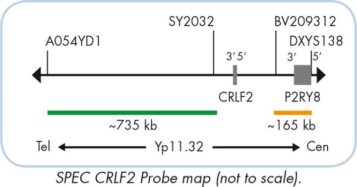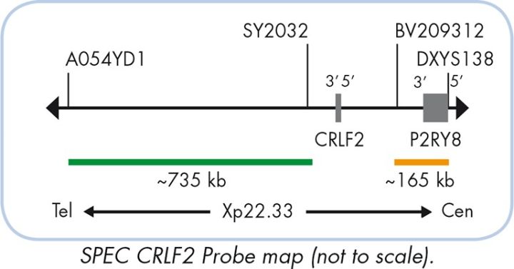 The SPEC CRLF2 Dual Color Break Apart Probe is a mixture of two direct labeled probes hybridizing to the Xp22.33 and Yp11.32 band, respectively. The orange fluorochrome direct labeled probe hybridizes proximal to the CRLF2 gene at Xp22.33 and Yp11.32, the green fluorochrome direct labeled probe hybridizes distal to the CRLF2 gene at Xp22.33 and Yp11.32.
