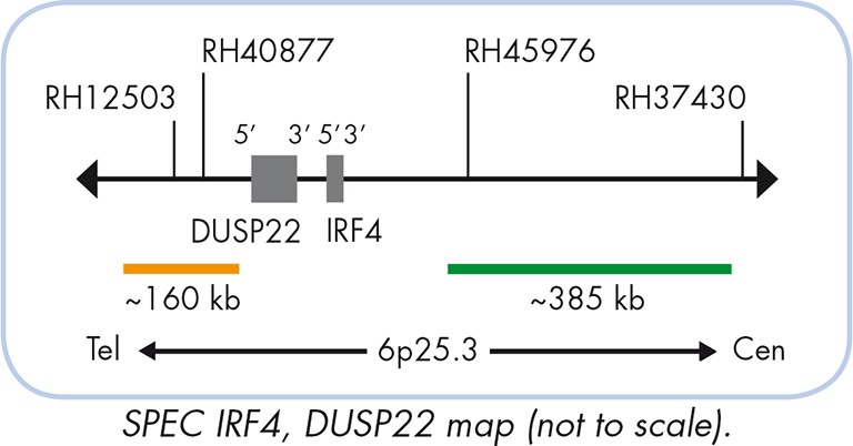 The ZytoLight SPEC IRF4,DUSP22 Dual Color Break Apart Probe is designed to detect translocations involving the DUSP22 and IRF4 genes. Rearrangements of the IRF4/DUSP22 chromosomal region have been detected in various B-cell and T-cell lymphomas.