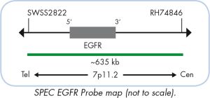 The ZytoLight ® SPEC EGFR/CEN 7 Dual Color Probe is designed for the detection of EGFR gene amplification frequently observed in solid neoplasms including non-small-cell lung cancer (NSCLC) and glioblastoma. The EGFR gene (a.k.a. ERBB1 and HER1) is located in the chromosomal region 7p11.2 and encodes a transmembrane glycoprotein acting as a cellular growth factor receptor. The protein belongs to the EGFR (epidermal growth factor receptor) subgroup of the RTK (receptor tyrosine kinase) superfamily also including ERBB2 (ERBB2), ERBB3 (HER3), and ERBB4 (HER4).