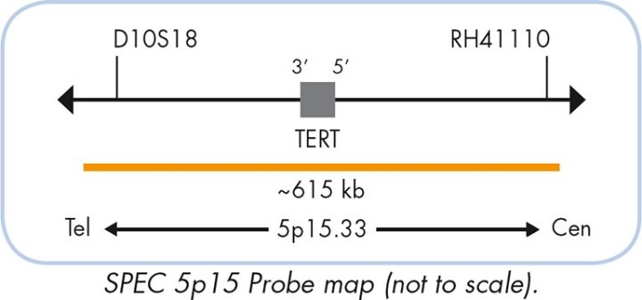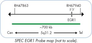 The SPEC EGR1/5p15 Dual Color Probe is a mixture of a green fluorochrome direct labeled SPEC EGR1 probe hybridizing to the EGR1 gene in the chromosomal region 5q31.2 and an orange fluorochrome direct labeled SPEC 5p15 probe specific for the chromosomal region 5p15.33.