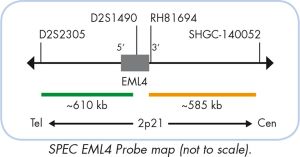 The SPEC EML4 Dual Color Break Apart Probe is a mixture of two direct labeled probes hybridizing to the 2p21 band. The orange fluorochrome direct labeled probe hybridizes proximal, the green fluorochrome direct labeled probe hybridizes distal to the EML4 gene breakpoint region at 2p21.