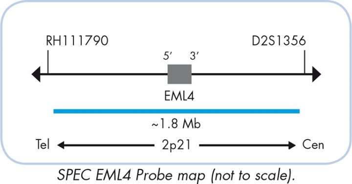 The ZytoLight SPEC ALK/EML4 TriCheckTM Probe is designed to detect inversions involving the chromosomal region 2p23.1-p23.2 harboring the ALK gene and the chromosomal region 2p21 harboring the EML4 gene. Moreover, using this probe it is possible to discriminate between EML4-ALK inversions and translocations affecting ALK, but not EML4.