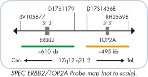 The ZytoLight ® SPEC ERBB2/TOP2A/ CEN 17 Triple Color Probe is designed for the simultaneous detection of ERBB2 and TOP2A gene status. The ERBB2 gene (a.k.a. HER2 and NEU) is located in the chromosomal region 17q12 and encodes a 185 kDa transmembrane glycoprotein. The TOP2A (topoisomerase II alpha) gene is located in the chromosomal region 17q21.2 and encodes a 170 kDa DNA topoisomerase. The TOP2A gene is frequently either co-amplified or deleted in ERBB2 positive breast cancer cases. TOP2A functions as the target for several anticancer agents, e.g. anthracyclines. Recent data suggests that amplification and deletion of the TOP2A gene locus may account for relative chemosensitivity or resistance to TOP2A inhibitor therapy in ERBB2 positive breast cancer. Thus, determination of the ERBB2 and TOP2A status may help to predict benefit from adjuvant anthracyclines in breast cancer treatment.