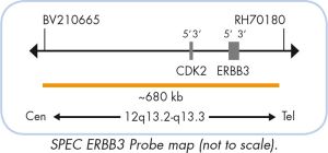 The ZytoLight ® SPEC ERBB3/CEN 12 Dual Color Probe and SPEC ERBB4/2q11 Dual Color Probe are designed for the detection of amplifications of the chromosomal regions harboring the genes ERBB3 and ERBB4, respectively. Genes ERBB3 (a.k.a. HER3) and ERBB4 (a.k.a. HER4) both encode transmembrane glycoproteins acting as cellular growth factor receptors. These proteins belong to the epidermal growth factor receptor subgroup of the receptor tyrosine kinase superfamily also including ERBB1 (EGFR) and ERBB2, known to be affected by gene amplifications in a number of malignant tumors. Although EGFR and ERBB2 have been shown to represent good predictive markers and appropriate targets for therapeutic approaches, relatively less is known of comparable significance for ERBB3 and ERBB4. However, there is growing evidence that cooperation of all four members of the ERBB gene family contributes to a more aggressive tumor phenotype and influences therapeutic response. Accordingly, it is assumed that the assessment of the combined amplification status of ERBB1 to ERBB4 may improve the diagnostic value significantly.