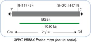 The ZytoLight ® SPEC ERBB3/CEN 12 Dual Color Probe and SPEC ERBB4/2q11 Dual Color Probe are designed for the detection of amplifications of the chromosomal regions harboring the genes ERBB3 and ERBB4, respectively. Genes ERBB3 (a.k.a. HER3) and ERBB4 (a.k.a. HER4) both encode transmembrane glycoproteins acting as cellular growth factor receptors. These proteins belong to the epidermal growth factor receptor subgroup of the receptor tyrosine kinase superfamily also including ERBB1 (EGFR) and ERBB2, known to be affected by gene amplifications in a number of malignant tumors. Although EGFR and ERBB2 have been shown to represent good predictive markers and appropriate targets for therapeutic approaches, relatively less is known of comparable significance for ERBB3 and ERBB4. However, there is growing evidence that cooperation of all four members of the ERBB gene family contributes to a more aggressive tumor phenotype and influences therapeutic response. Accordingly, it is assumed that the assessment of the combined amplification status of ERBB1 to ERBB4 may improve the diagnostic value significantly. Recently it was shown in a retrospective study that responsiveness to Herceptin™ turned out to be more efficient if tumour cells show ERBB4 gene amplification.
