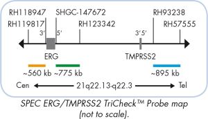 The ZytoLight ® SPEC ERG/TMPRSS2 TriCheck™ Probe is designed to detect deletions between the ERG and the TMPRSS2 gene at 21q22 resulting in the TMPRSS2- ERG fusion. Furthermore, the triple color approach allows the detection of other translocations affecting either of these genes. ERG (ETS-related gene) rearrangements have been observed in 40-60% of prostate cancers identified via prostate-specific antigen (PSA) screening. The most common aberration affecting ERG is the interstitial deletion of about 3 Mb at the chromosomal region 21q22 found in 90% of the cases. This deletion leads to the fusion of the hormonally regulated promoter of the TMPRSS2 (transmembrane protease, serine 2) gene to the coding region of ERG, resulting in overexpression of the ERG transcription factor. The deleted fragment is sometimes observed as insertion on other chromosomes. However, about 10% of the ERG rearranged prostate cancer cases show alternative fusions, as e.g. SLC45A3-ERG. On the other hand non-ERG translocations fusing TMPRSS2 to other ETS family members, as e.g. TMPRSS2-ETV1, have been found in a few percent of these malignancies