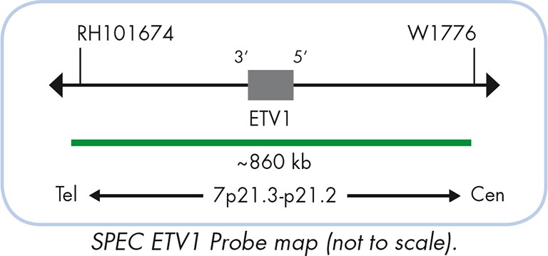 The ZytoLight ® SPEC ETV1/CEN 7 Dual Color Probe is designed for the detection of ETV1 gene amplifications observed e.g. in melanoma. The ETV1 (ETS translocation variant 1, a.k.a. ER81) gene is located on chromosome 7p21.2 and encodes an ETS (E26 transformation-specific) transcription factor. The gene was first identified as a fusion partner of the EWS gene in Ewing’s sarcoma. Moreover, it was frequently found to be fused to TMPRSS2 (transmembrane protease, serine 2) in prostate cancer. ETV1 amplification or copy number gain of chromosome 7p was detected in melanoma, lung adenocarcinoma of never smokers, and pleomorphic liposarcoma. In melanoma, more than 40% of the cases show amplification or copy number gain of the ETV1 locus. As ectopic ETV1 overexpression in the context of aberrant MAP kinase pathway activation was found to transform immortalized human melanocytes, it was suggested that ETV1 acts as a melanoma oncogene