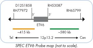 The ZytoLight ® SPEC ETV6 Dual Color Break Apart Probe is designed for the detection of translocations involving the chromosomal region 12p13.2 harboring the ETV6 (ETS variant gene 6, a.k.a. TEL) gene. ETV6 is a member of the ETS family of transcription factors. More than 40 translocations with ETV6 involvement have been reported in diverse types of hematological and non-hematological malignancies. The balanced chromosomal translocation t(12;21)(p13.2;q22.1), which leads to ETV6-RUNX1 fusion, represents the most frequent genetic rearrangement (19-27%) in initial childhood B-cell precursor (BCP) acute lymphoblastic leukemia (ALL) and has been associated with good prognosis. The ETV6-NTRK3 gene fusion resulting from the t(12;15)(p13.2;q25) translocation was found to be characteristic for mammary analogue secretory carcinoma (MASC) of the salivary glands. Since MASC morphologically mimics other neoplasms, the detection of ETV6 rearrangements may be helpful for the differential diagnosis of MASC. In a subgroup of myeloproliferative disorders, the t(5;12)(q32;p13.2) translocation is a recurrent chromosome abnormality resulting in the fusion of ETV6 to the receptor tyrosine kinase PDGFRB. Patients carrying the t(5;12) translocation can be successfully treated with tyrosine kinase inhibitors.