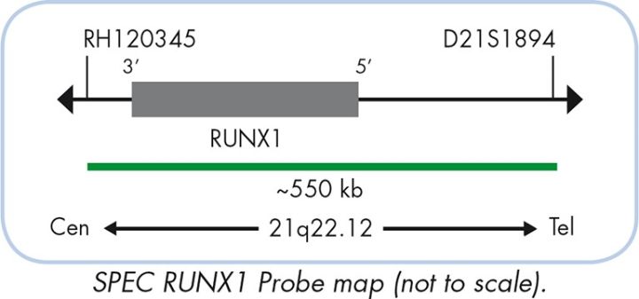 The ZytoLight ® SPEC ETV6/RUNX1 Dual Color Dual Fusion Probe is designed for the detection of the specific translocation involving the chromosomal region 12p13.2 harboring the ETV6 (ETS variant gene 6, a.k.a. TEL) gene and the chromosomal region 21q22.12 harboring the RUNX1 (runt-related transcription factor 1, a.k.a. AML1) gene. The balanced chromosomal translocation t(12;21)(p13.2;q22.1), which leads to ETV6/RUNX1 fusion, represents the most frequent genetic rearrangement in initial childhood B-cell precursor (BCP) acute lymphoblastic leukemia (ALL) (19-27%) and has been associated with good prognosis. The ETV6/RUNX1 fusion protein, comprising a putative repressor domain of ETV6, a member of the ETS family of transcription factors, fused to RUNX1, the DNA-binding subunit of the RUNX1/CBF beta transcription factor complex, acts as a trans-dominant repressor of RUNX1 regulated target genes involved in hematopoiesis. Three secondary aberrations in ETV6/ RUNX1 positive ALL have been found to negatively influence the clinical course: deletion of the second non-translocated ETV6 allele, gains of the RUNX1 gene, and duplication of the derivative chromosome 21. Detection of t(12;21) by Fluorescence in situ Hybridization enables the simultaneous identification of the most common secondary changes and thus provides additional information about the possible outcome of the disease in patients with ALL