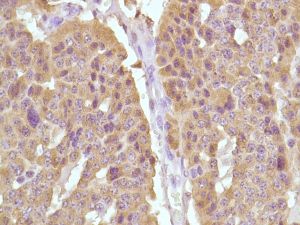 Calcitonin is a 32 amino acid peptide which can be demonstrated in C cells of the normal and hyperplastic thyroid. Staining for calcitonin may be used for the identification of a spectrum of C cell proliferative abnormalities ranging from C cell hyperplasia to invasive tumors. Staining for calcitonin in medullary carcinoma of the thyroid produces a fine granular pattern in the cytoplasm. Amyloid deposits within the tumor may also exhibit varying degrees of calcitonin activity.