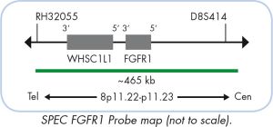 The ZytoLight ® SPEC FGFR1/CEN 8 Dual Color Probe is designed for the detection of FGFR1 gene amplification frequently observed in malignant tumors e.g. breast and prostate cancer and oral squamous cell carcinoma (OSCC). The FGFR1 (fibroblast growth factor receptor 1) gene is located in the chromosomal region 8p11.23-p11.22 and encodes a transmembrane receptor tyrosine kinase. Amplification of the FGFR1 gene, observed in approximately 10% of all breast cancer samples, has revealed to be an independent prognostic factor for overall survival. FGFR1 is believed to emerge as a potential therapeutic target for lobular breast carcinomas.
