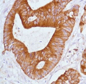 Keratin 20 / cytokeratin20 (CK20) is a Type-I keratin which is primarily expressed in gastric and intestinal epithelium, urothelium, and Merkel-cells. CK20 is expressed in adenocarcinomas of the colon, stomach, pancreas and bile system, mucinous ovarian tumors, transitional-cell and Merkel-cell carcinomas. CK20 is negative in squamous cell carcinomas and adenocarcinomas of the breast, lung, and endometrium, non-mucinous tumors of the ovary, and small cell carcinomas.