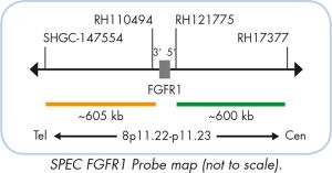 The ZytoLight ® SPEC FGFR1 Dual Color Break Apart Probe is designed to detect rearrangements involving the chromosomal region 8p11.23-p11.22 harboring the FGFR1 (fibroblast growth factor receptor 1, a.k.a. FLT2 and FLG) gene. Translocations affecting FGFR1 are hallmarks of the 8p11 myeloproliferative syndrome (EMS), also known as stem cell leukemia/lymphoma syndrome, an aggressive stem cell myeloproliferative neoplasm that is associated with eosinophilia, poor prognosis, T-cell lymphoma, and frequent progression to acute myeloid leukemia. The most common translocation detected in EMS is t(8;13)(p11.2;q12.1) fusing FGFR1 to ZMYM2 (a.k.a. ZNF198). Several other rearrangements affecting the FGFR1 locus are also common in EMS, all of which result in fusion proteins comprising the tyrosine kinase domain of FGFR1 and a dimerization domain of a partner protein. Due to dimerization these fusion proteins show constitutive kinase activity. Currently, bone marrow or stem cell transplantation is the only curative treatment for patients with EMS. In vitro studies suggest that certain receptor tyrosine kinase inhibitors may provide a new therapeutic option.