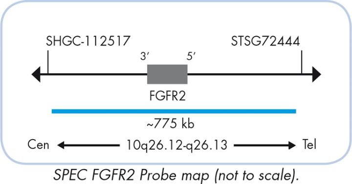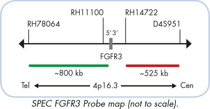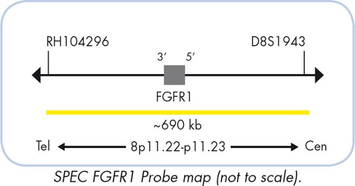 The ZytoLight ® SPEC FGFR3 Break Apart/ FGFR2/FGFR1 Quadruple Color Probe is designed for the simultaneous detection of FGFR3 gene rearrangements, and of the FGFR2 and FGFR1 gene copy number status. Fibroblast growth-factor receptors (FGFRs) are involved in the regulation of organ development, cell proliferation and migration, and other processes. FGFR-activating genetic changes, including amplifications and translocations, were shown to be associated with the development and progression of tumors. Rearrangements affecting the FGFR3 gene are frequently found in carcinomas of various types, including multiple myeloma (MM), bladder cancer, glioblastoma, and lung squamous cell carcinoma. FGFR2 amplifications were found to occur in some gastric and breast tumors. FGFR1 is amplified in 21% of lung adenocarcinomas but also in other solid tumors, including oral squamous cell carcinoma, breast, ovarian, and bladder cancer. Various types of FGFR inhibitors are available, some of which have entered anti-tumor clinical trials and have shown promising clinical effects and application prospects. Thus, detection of FGFR aberrations may help in selecting patients eligible for an FGFR-targeted therapy.