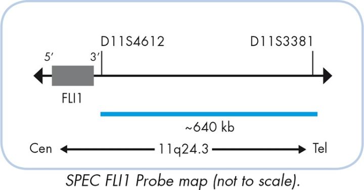 The ZytoLight SPEC EWSR1/FLI1 TriCheckTM Probe is designed to detect translocations involving the EWSR1 gene and the FLI1 gene. t(11;22)(q24.3;q12.2) is the most frequent translocation in Ewing sarcoma or peripheral primitive neuroectodermal tumors (PNET) juxtaposing the EWSR1 gene next to the FLI1 locus. Detection of the EWSR1 rearrangements by FISH can be used to confirm the diagnosis of Ewing sarcoma/PNET.