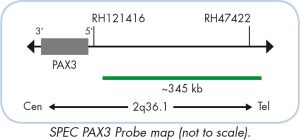 The ZytoLight ® SPEC FOXO1/PAX3 Dual Color Single Fusion Probe and SPEC FOXO1/PAX7 Dual Color Single Fusion Probe are designed to detect translocations t(2;13)(q36;q14.1) and t(1;13)(p36.1;q14.1) in alveolar rhabdomyosarcomas. Among solid tumors of the childhood, rhabdomyosarcoma is the most common soft tissue sarcoma. Rhabdomyosarcomas are classified in two main categories: embryonal and alveolar rhabdomyosarcoma. The alveolar histology is associated with a poorer prognosis. Alveolar rhabdomyosarcoma is characterized by two tumor-specific translocations, i.e., t(2;13)(q36;q14.1) and t(1;13) (p36.1;q14.1) which are detectable in most cases of alveolar rhabdomyosarcomas. The translocations and their fusion genes represent highly specific genetic markers useful in the diagnosis of alveolar rhabdomyosarcomas. Correlations between the type of translocation and clinical features as e.g. longer disease-free survival have been identified.