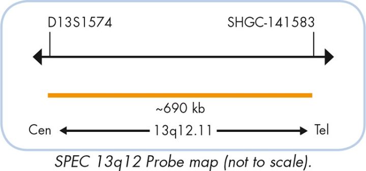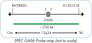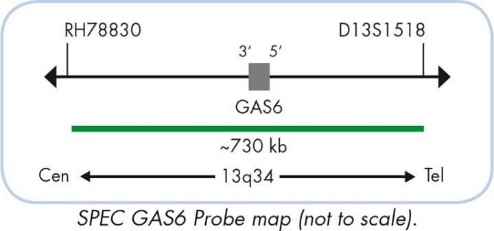The ZytoLight ® SPEC GAS6/13q12 Dual Color Probe is designed for the detection of amplifications of the chromosomal region harboring the GAS6 gene. The GAS6 (growth arrest-specific 6, a.k.a. AXSF, AXLLG) gene is located on chromosome 13q34 and encodes a ligand for the receptor tyrosine kinase family TAM which includes the proteins TYRO3, AXL, and MERTK. GAS6 has the highest affinity for AXL, followed by TYRO3, and MERTK. Binding of GAS6 to TAM receptors has been shown to promote proliferation and survival of cancer cells in vitro. GAS6 overexpression and its association with poorer prognosis has been reported in several human cancers including glioblastoma, pancreatic ductal adenocarcinoma, ovarian cancer, and cytogenetically normal acute myeloid leukemia. In patients with gastric cancer, high expression of GAS6 was shown to be associated with lymph node metastasis. GAS6 has been shown to be a target for overexpression and amplification in breast cancer positively correlating with a number of favorable prognostic markers including smaller tumor size. Hence, the identification of GAS6 gene copy number changes by Fluorescence in situ Hybridization may be of prognostic significance in various types of tumors. Moreover, interventions which inhibit GAS6 pathways could have therapeutic potential.