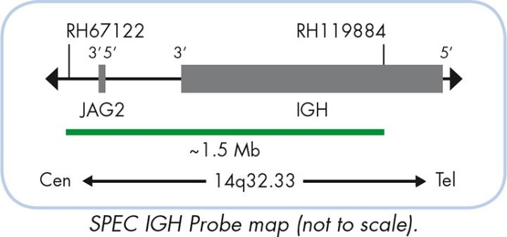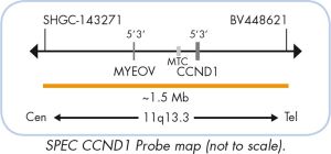 The ZytoLight ® SPEC CCND1/IGH Dual Color Dual Fusion Probe is designed to detect translocation t(11;14)(q13.3;q32.3) frequently found in mantle cell lymphomas. The translocation juxtaposes the CCND1 gene (cyclin D1, a.k.a. PRAD1 and BCL1) next to the IGH (immunoglobulin heavy locus, a.k.a. IGH@) locus and results in constitutive overexpression of CCND1. The translocation t(11;14)(q13.3;q32.3) that involves the CCND1 and IGH gene regions is detected in up to 95% of patients with mantle cell lymphomas (MCL) and are considered to be the genetic hallmark of this subtype of low-grade peripheral B-cell neoplasms. However, the t(11;14) has also been identified in other lymphoproliferative disorders (LPDs), such as B-prolymphocytic leukemia (PLL), and, less frequently, in plasma cell myelomas, B-cell chronic lymphocytic leukemia, and in splenic lymphomas with villous lymphocytes (SLVL). Since the course of MCL is aggressive, and its response to standard chemotherapy is poor, differential diagnosis from other chronic lymphoproliferative disorders via detection of the t(11;14) translocation might be of great clinical importance.
