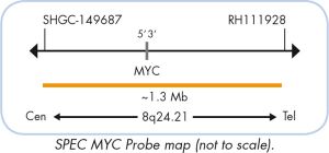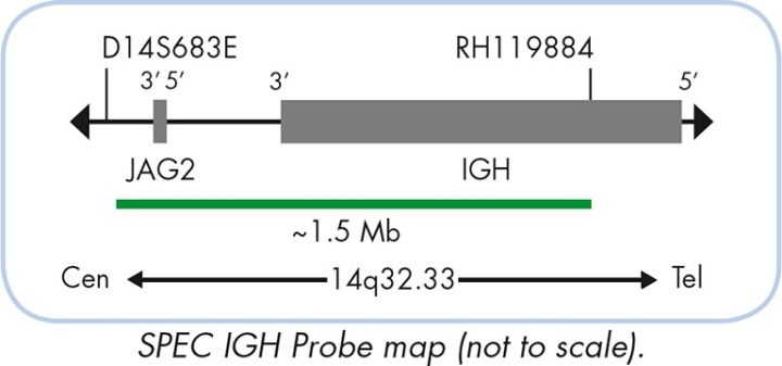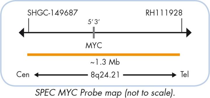 The ZytoLight ® SPEC MYC/IGH Dual Color Dual Fusion Probe is designed to detect the translocation t(8;14)(q24;q32) affecting the MYC gene in the chromosomal region 8q24.21 and the IGH locus in 14q32.33. The MYC proto-oncogene (v-myc avian myelocytomatosis viral oncogene homolog, a.k.a. CMYC) encodes a transcription factor essential for cell growth and proliferation and is broadly implicated in tumorigenesis. Translocations involving the MYC gene are considered to be cytogenetic hallmarks for Burkitt Lymphoma (BL) but are also found in other types of lymphomas. The most frequent translocation involving the MYC gene region t(8;14) (q24.21;q32.3) can be found in approx. 80% of the BL cases and juxtaposes the MYC gene next to the IgH (immunoglobulin heavy chain) locus. Further translocations affecting the MYC gene are t(8;22)(q24.21;q11.2) and t(2;8) (p11.2;q24.21), both of which involve one of the two immunoglobulin light chain loci. All three translocations bring the MYC gene under the control of a regulatory element from one of the immunoglobulin loci resulting in constitutive overexpression of MYC. The identification of MYC specific rearrangements is a critical part of the diagnostic work-up and management of patients, identifying those who will benefit from the intensive therapeutic regimens used to treat BL. Fluorescence in situ Hybridization (FISH) which allows the correlation with immunochemistry can be critical to patient management and is an approach commonly used.