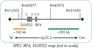 The ZytoLight SPEC IRF4,DUSP22 Dual Color Break Apart Probe is designed to detect translocations involving the DUSP22 and IRF4 genes. Rearrangements of the IRF4/DUSP22 chromosomal region have been detected in various B-cell and T-cell lymphomas. Large B-cell lymphoma (LBCL) with IRF4 rearrangement is considered a distinct new provisional entity. Most cases have IG/IRF4 fusions and have a favorable prognosis. Moreover, IRF4 translocation has a high specificity for cutaneous cutaneous anaplastic large cell lymphoma (ALCL) supporting the clinical utility of FISH for IRF4 in the differential diagnosis of T-cell lymphoproliferative disorders.