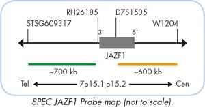 The ZytoLight ® SPEC JAZF1 Dual Color Break Apart Probe is designed to detect translocations involving the chromosomal region 7p15.1-p15.2 harboring the JAZF1 (Juxtaposed with Another Zinc Finger) gene. Translocations involving the region 7p15.1-p15.2 are frequently found in endometrial stromal sarcoma (ESS). The most common cytogenetic abnormality detected in 33-80% of ESS is t(7;17) (p15.1-p15.2;q11.2) which results in the fusion of the JAZF1 gene at 7p15.1-p15.2 to the JJAZ1 (Joined to JAZF1; a.k.a. SUZ12) gene at 17q11.2. Both genes involved contain zinc finger domains characteristic for DNA binding proteins. It was shown that the fusion protein JAZF1- JJAZ1 can promote cell proliferation when the wild-type JJAZ1 is silenced as it is in ESS harboring the t(7;17). In 25-30% of ESS the JAZF1 gene is disrupted by another translocation t(6;7) where the first zinc finger domain of JAZF1 is fused to both zinc finger domains of the PHF1 (PHD finger protein 1) gene at 6p21.32. As a result the entire coding region of PHF1 is regulated by the JAZF1 promoter. Since the diagnosis of ESS is often difficult in cases showing diverse histological differentiation or in undifferentiated endometrial sarcoma (UES), the detection of the JAZF1 translocations can serve as a diagnostic tool to confirm the diagnosis of ESS.