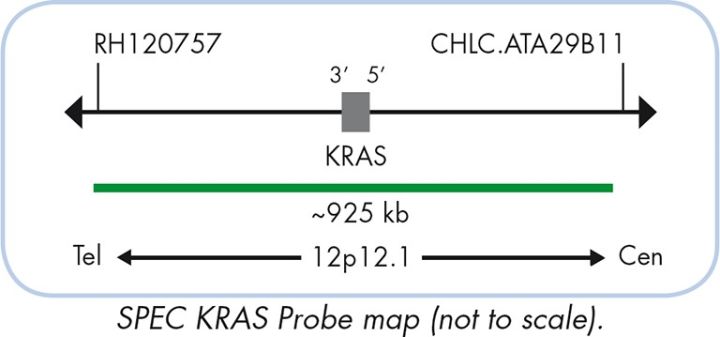 The ZytoLight ® SPEC KRAS/CEN 12 Dual Color Probe is designed for the detection of KRAS gene amplifications found e.g. in lung cancer. The KRAS (v-Ki-ras2 Kirsten rat sarcoma viral oncogene homolog) gene located on chromosome 12p12.1 is a member of the RAS gene family comprising HRAS, KRAS, and NRAS, all of which encode a 21 kDa protein. The wildtype proteins play a pivotal role in cell proliferation, differentiation, and senescence. Mutations of KRAS are frequently found in epithelial malignancies and lead to activation of the downstream mitogen-activated protein kinase (MAPK) resulting in unchecked cellular proliferation and tumor progression. Amplifications of KRAS and the implications in tumorigenesis are not as well characterized as KRAS mutations. However, recent studies using different methods found amplification of KRAS or copy number gain of the 12p12.1 region including KRAS in various primary tumors, as e.g. in lung, colorectal, pancreatic, and gastric cancers. For non-small cell lung cancer (NSCLC) patients KRAS amplification as assessed by Fluorescence in situ Hybridization (FISH) was detected in about 15% of the tumors. Amplification of KRAS was found to be correlated with poor prognosis and may act synergistically with KRAS mutations to promote tumor progression.